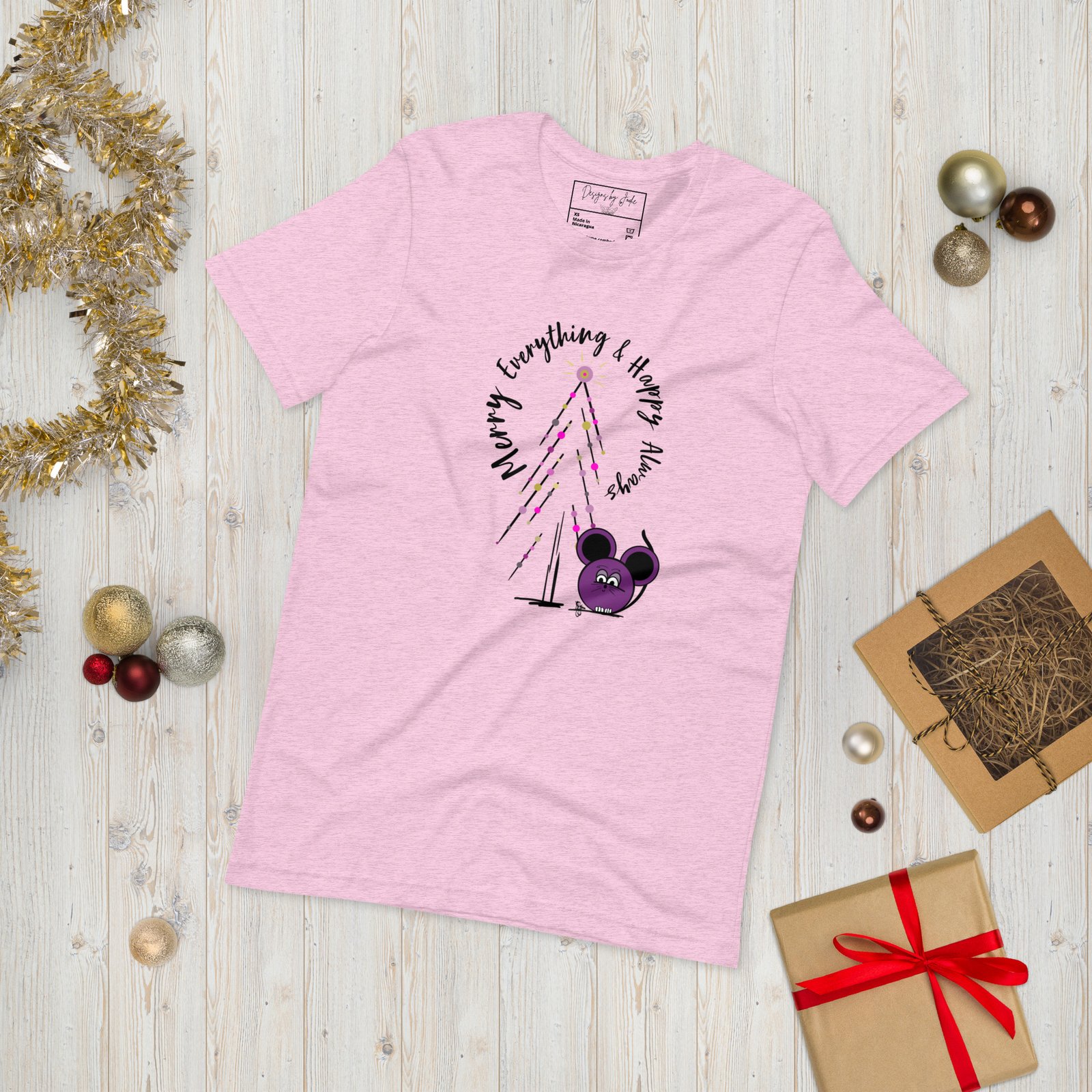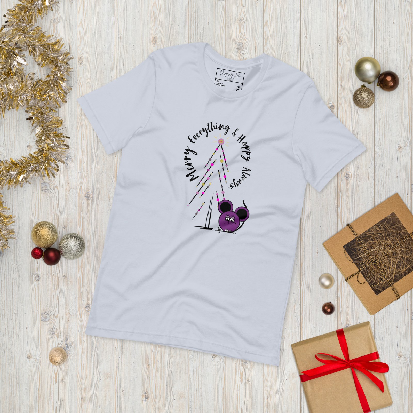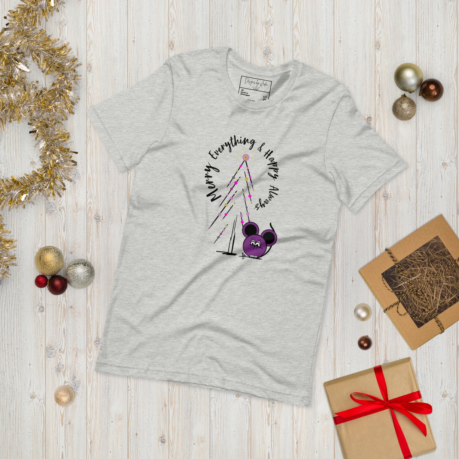 Add a touch of holiday elegance to your wardrobe with this beautifully designed “Merry Everything & Happy Always” graphic tee, featuring a whimsical wee friend and a colorful modern line art Christmas tree motif. With its vibrant colors and unique, modern style, this graphic tee is a great choice for holiday gatherings, cozy nights, or festive outings. This is the tee that you’ve been looking for, and it’s bound to become a favorite in your holiday wardrobe. It’s light, soft, and comes with a unique design that stands out from the crowd wherever you go!